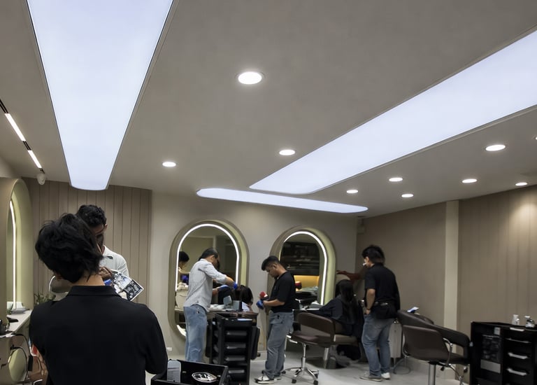Hechura delivered premium lighting design and luxury stretch ceiling installation that elevated Bariks Salon, Kochi, with elegance and perfect illumination.”